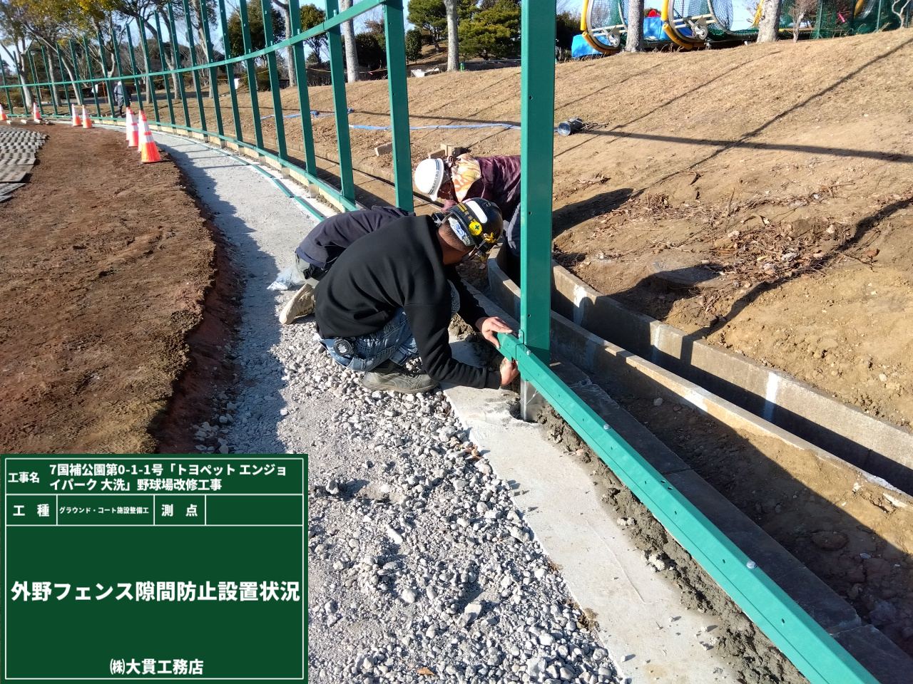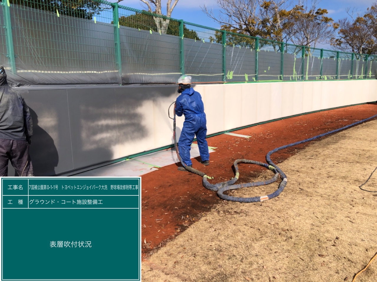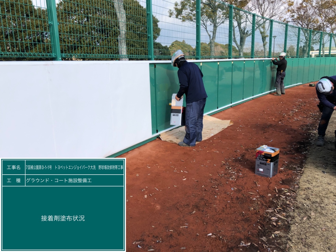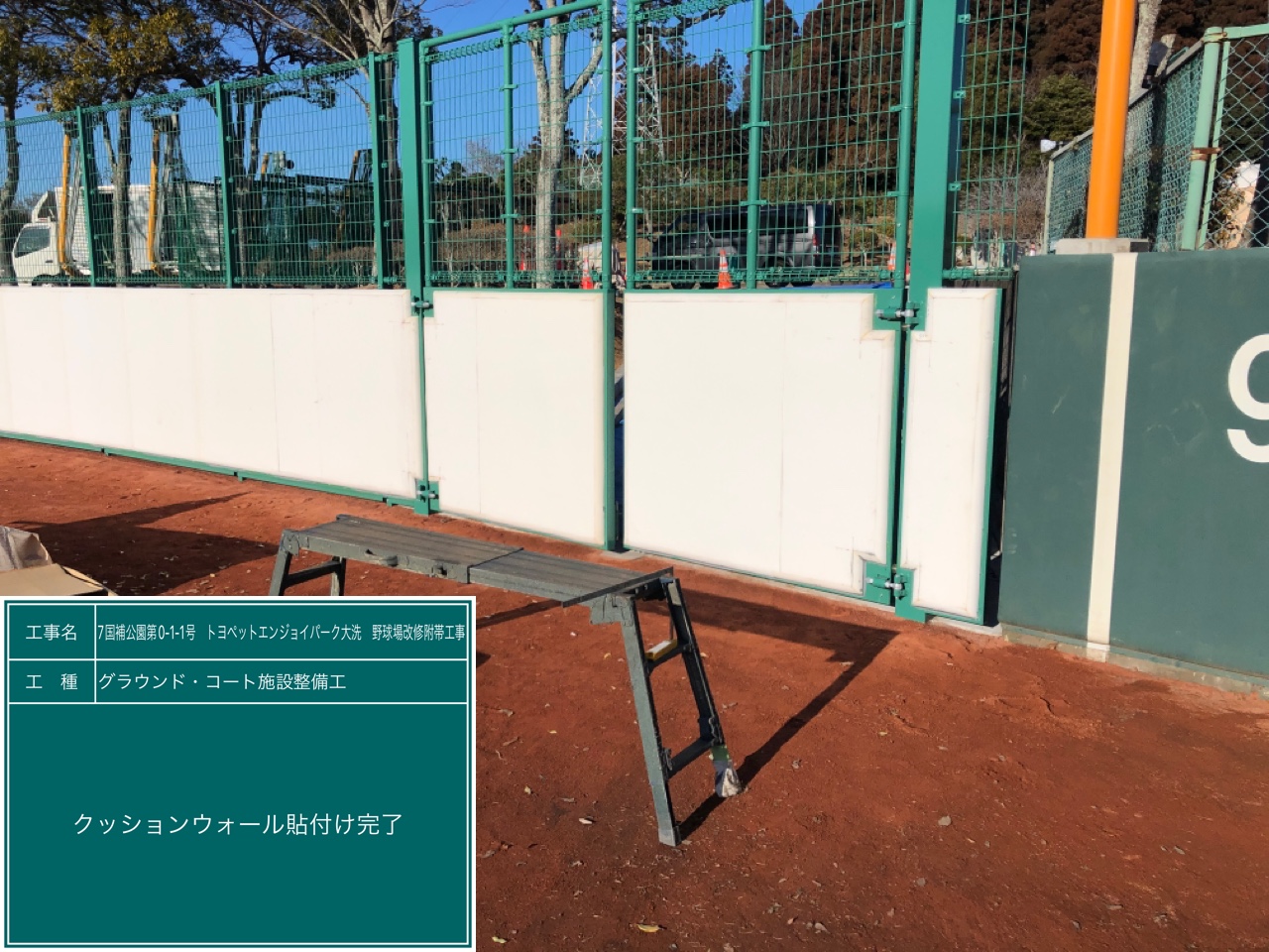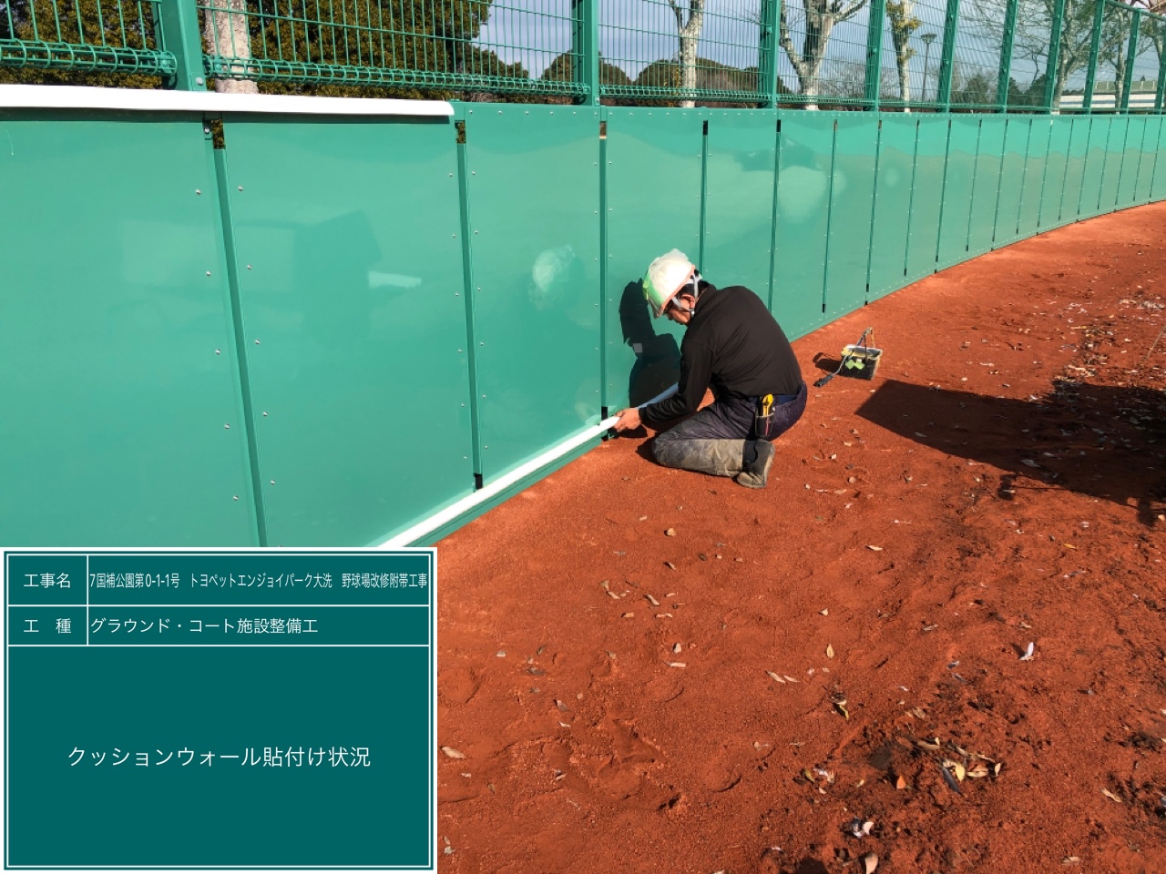 写真は、1枚1枚フェンスに防護マット(クッションウォール)を貼付けている様子です👇👇
