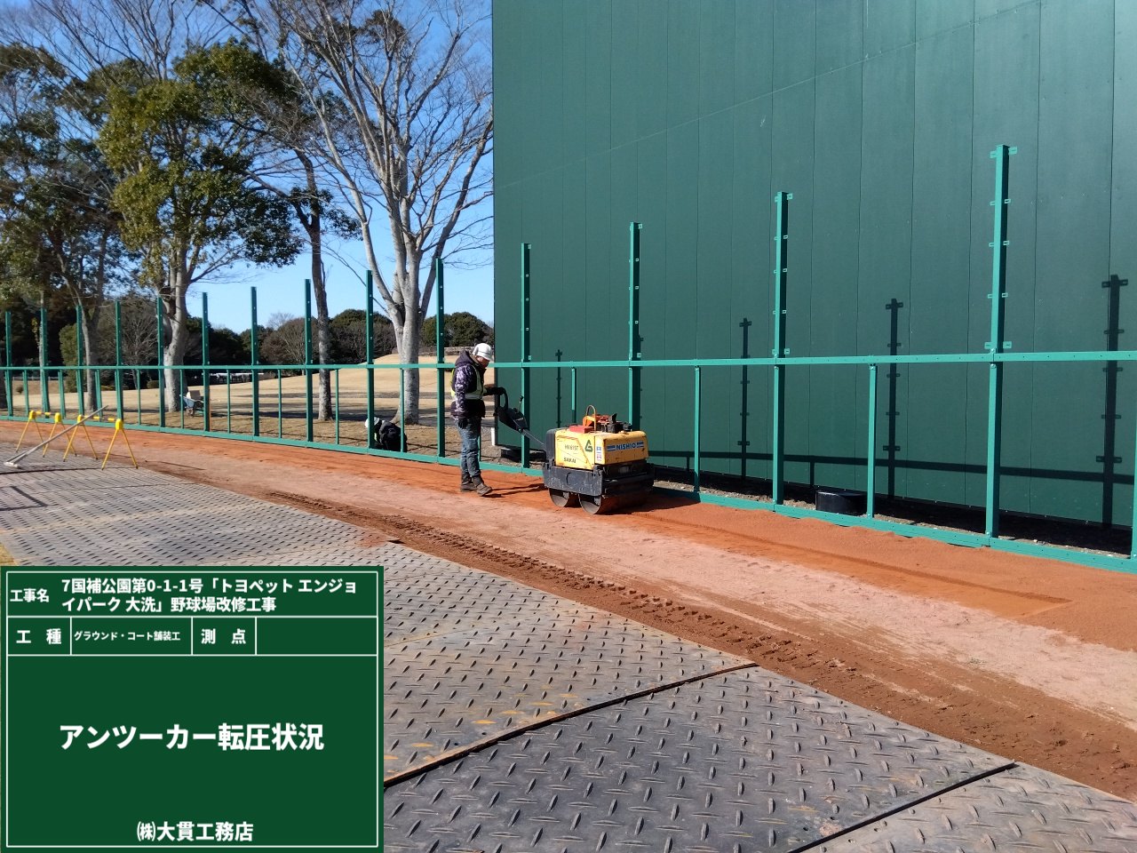 現場でよく使われる”鉄板”ではなく、芝生の損傷を軽減するために軽量で扱いやすいプラスチック製の敷板を使っています👆