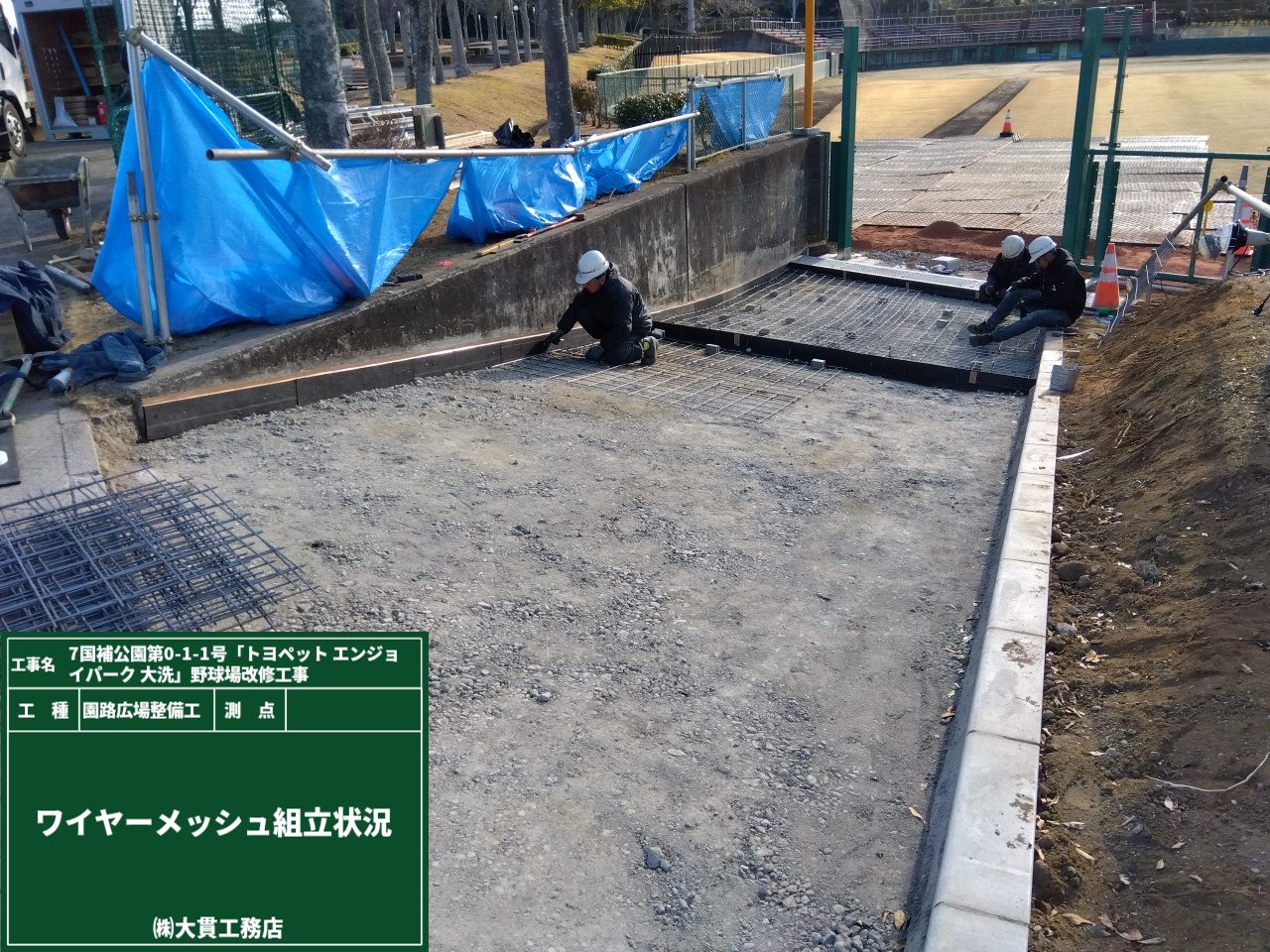 打設前に路盤を整え、ワイヤーメッシュとスペーサーブロックを設置します。