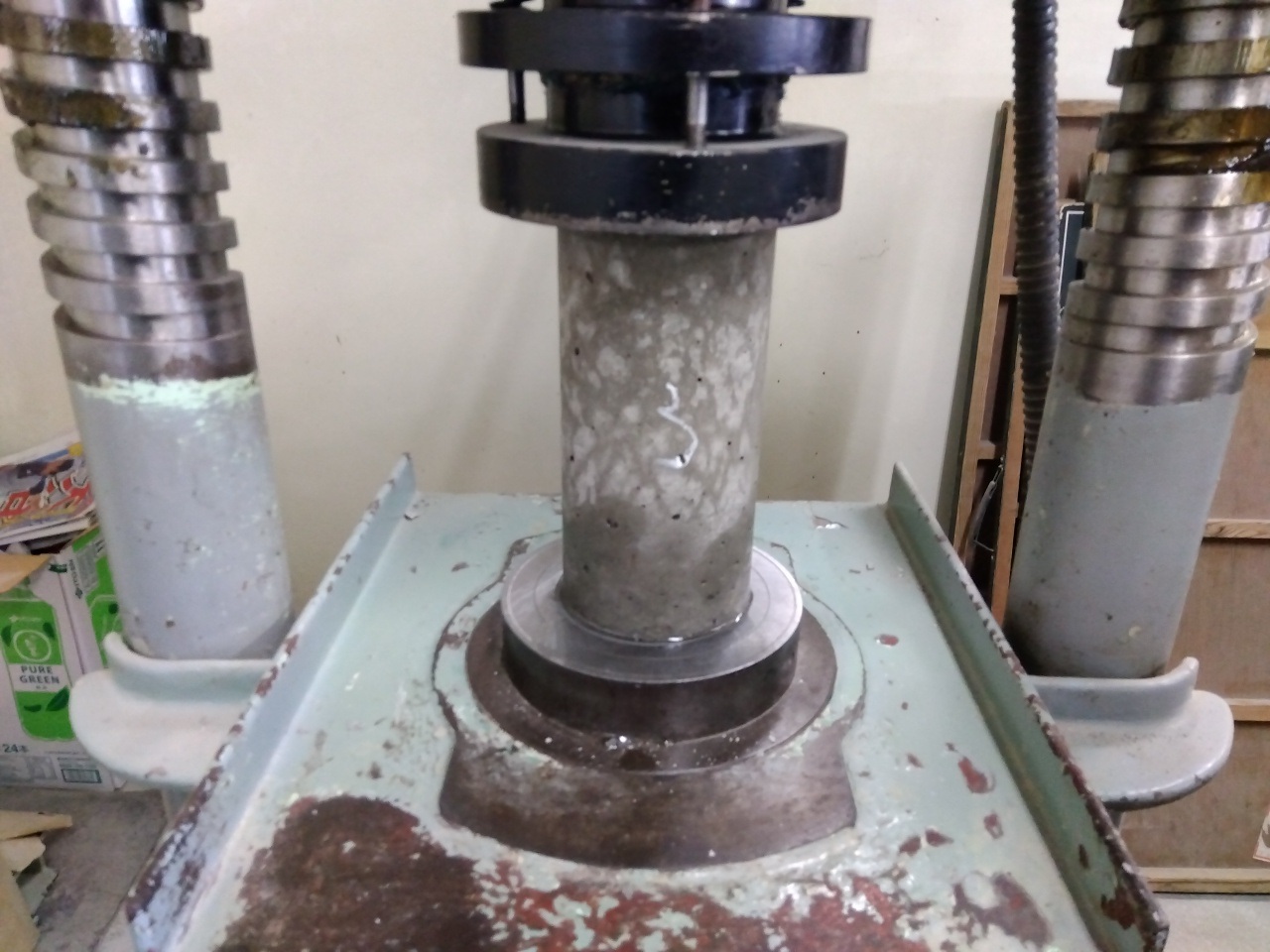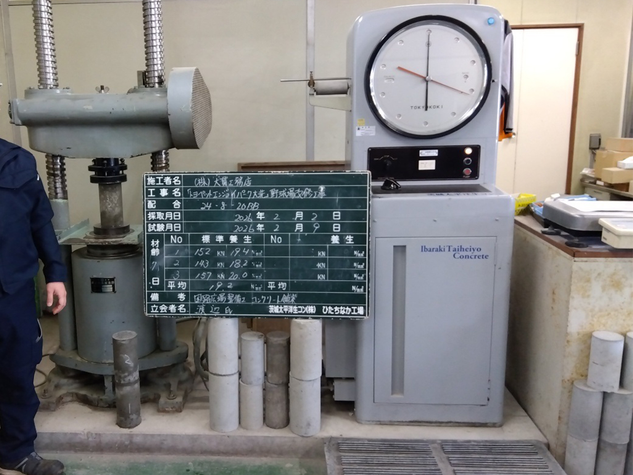 今回は、打設してから7日目(材齢7日)のテストピースを使って「1週強度」試験です。