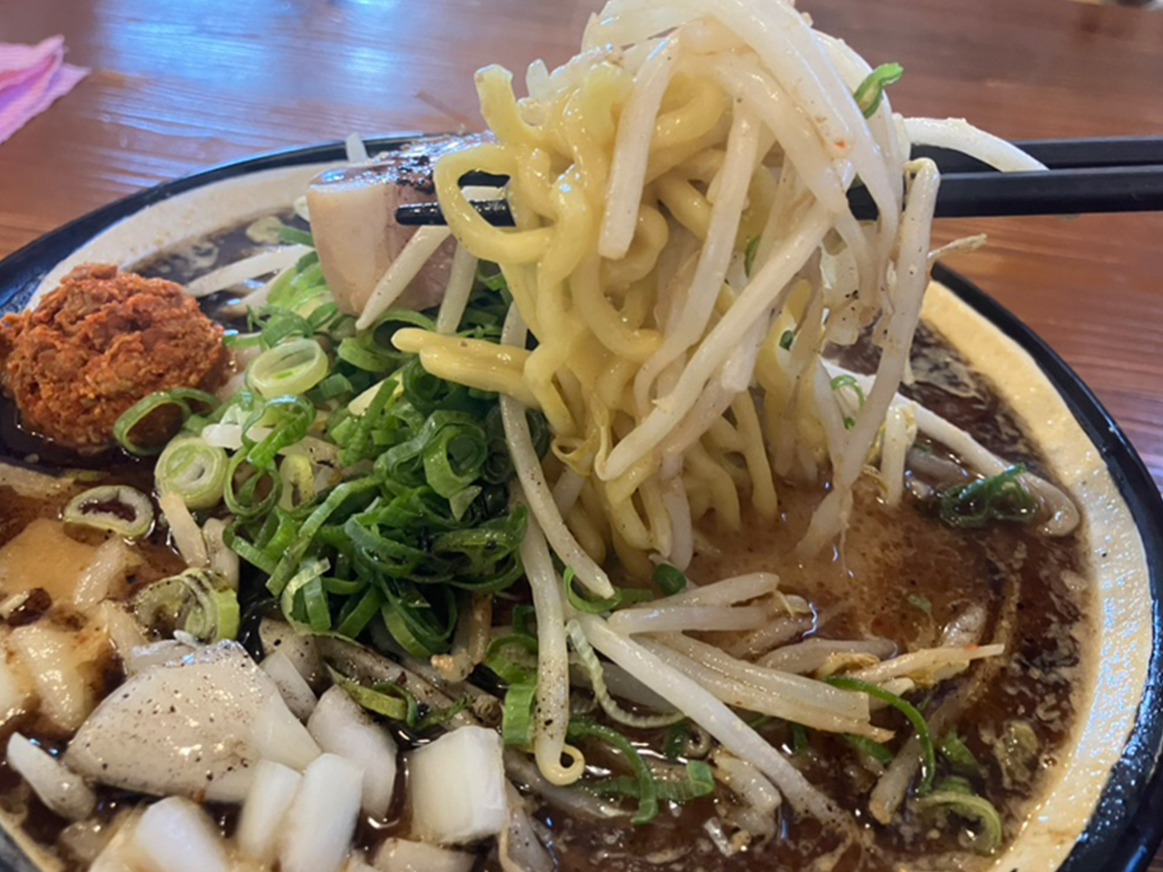 麺を彩るのは玉ねぎ、もやし、ネギ、チャーシューです。
