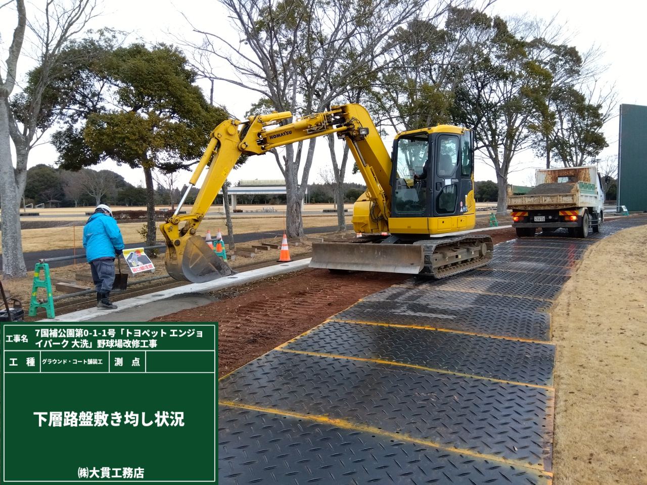 現場でよく使われる”鉄板”ではなく、芝生の損傷を軽減するために軽量で扱いやすいプラスチック製の敷板を使っています👆